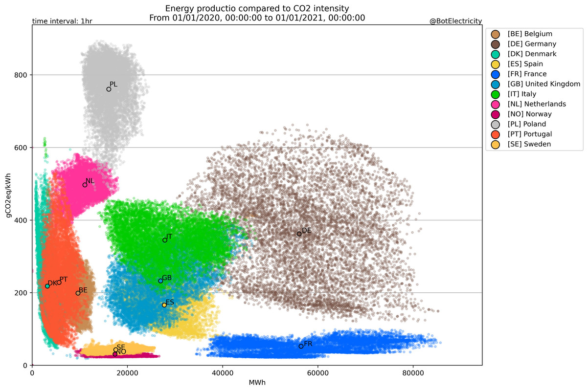 Joe P: the chart shows the grid average for each country. Incremental demand, such as exports from France to us, will be met by the “swing source” which takes up the slack between demand and the available zero-carbon power: probably gas or coal.