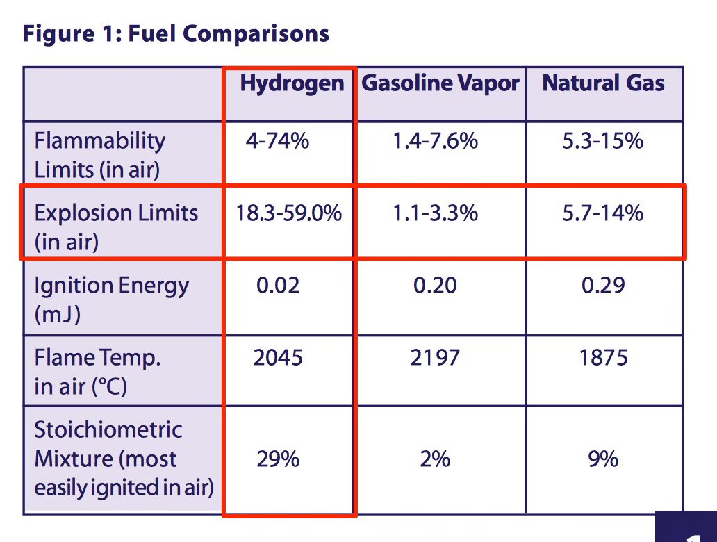 Note H2’s wider ‘Explosive Limits’ and the lower amount of energy needed to (accidentally) ignite it.