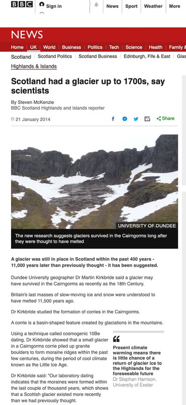 As a boy, I recall a very large snow field on the N facing slopes of Ben Nevis. The locals said it had always been there => relic of LIA. It has since gone. But I note the quote from Stephen Harrison bottom right.